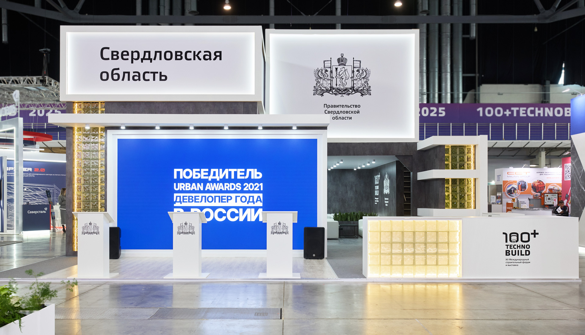 В рамках выставки компания R2GROUP создала сдержанный двухэтажный стенд для Правительства Свердловской области